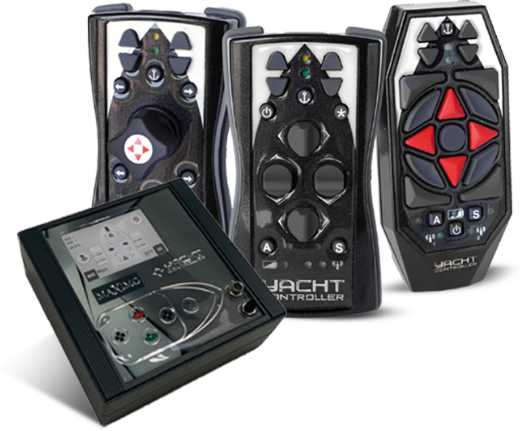 The joystick allows control of the engines, bow thruster, and stern thruster, while the buttons provide control over the anchor winch or winches, manual and automatic modes, throttle, and potentially other ON/OFF devices on the vessel.